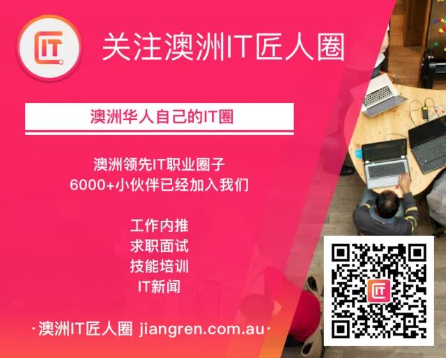 我们是澳洲领先的IT技术交流求职群体,目前已经有六千多个小伙伴,而且我们这个群体在不断壮大中,交流技术、工作内推,欢迎IT行业同仁加入,需要合作的请在后台留言。目前大群人数已过百,想要入群的朋友