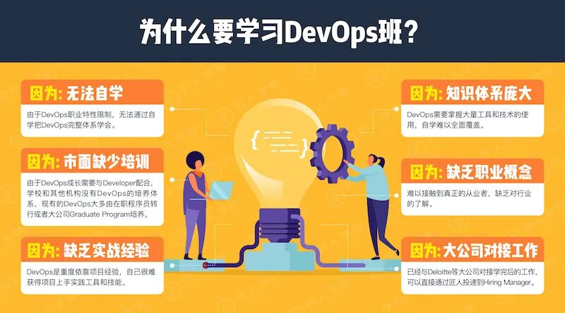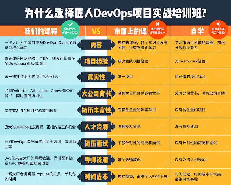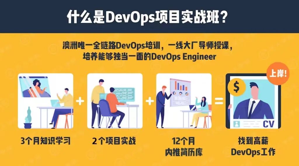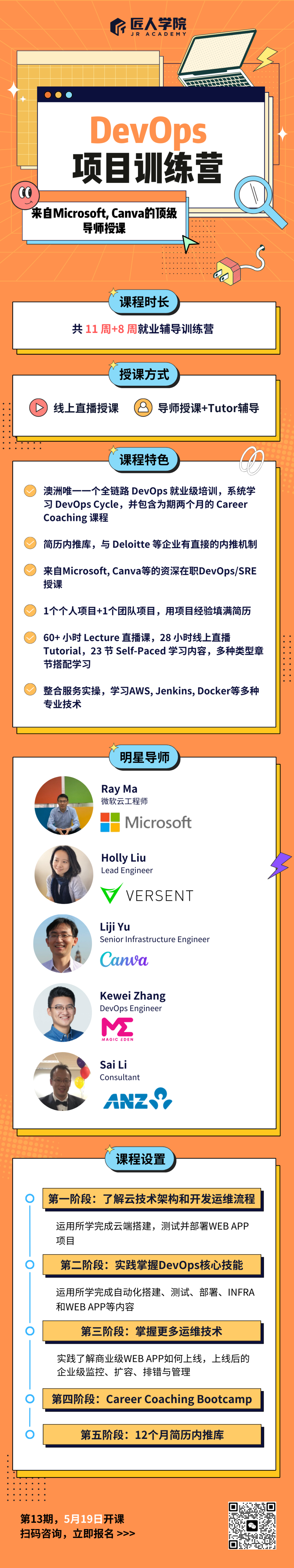 DevOps项目训练营,也即DevOps项目实战班,是匠人学院开设的澳洲唯一的全链路 DevOps 培训。学员能够系统学习 DevOps Cycle,并获赠为期两个月的 Career Coaching 课程,千位毕业生拿到 Offer,年薪 10w+。学员将参与60+小时的Lecture 直播课、28 小时的线上直播Tutorial、23 节 Self-Paced 学习内容,多种类型章节搭配学习。
