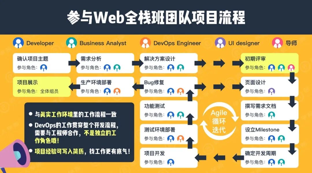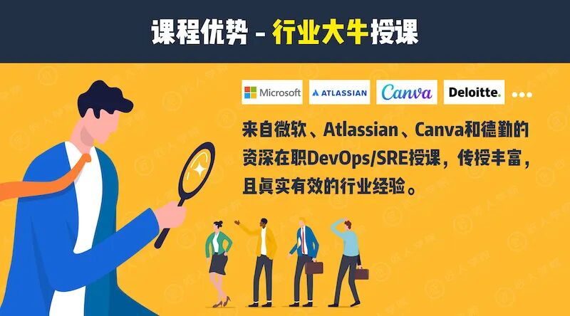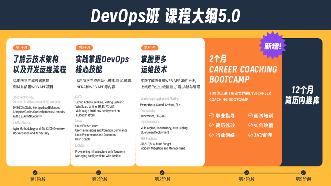 有众多一线大厂导师授课,3+2+12的模式助力你的 DevOps之路。通过3 个月的课程学习、2 个项目实战、12个月的内推简历库,DevOps项目训练营将带你学会通过持续集成和持续交付(CI/CD),容器化 Containerization,系统语言 Linux 等知识,来帮助 Agile 开发流程下的互联网产品进行持续更新和版本上线。