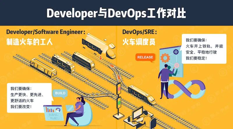 再通俗点来说,如果把每段代码比作一列火车,Developer 就是造火车的工程师,DevOps 则负责让火车在轨道上跑起来。比如对于一个商业软件/网站来说,提交代码只是所有工作的20%,离真正把代码部署到软件的生产环境(production environment), 也就是用户使用的环境还有一定距离,那就离不开DevOps。