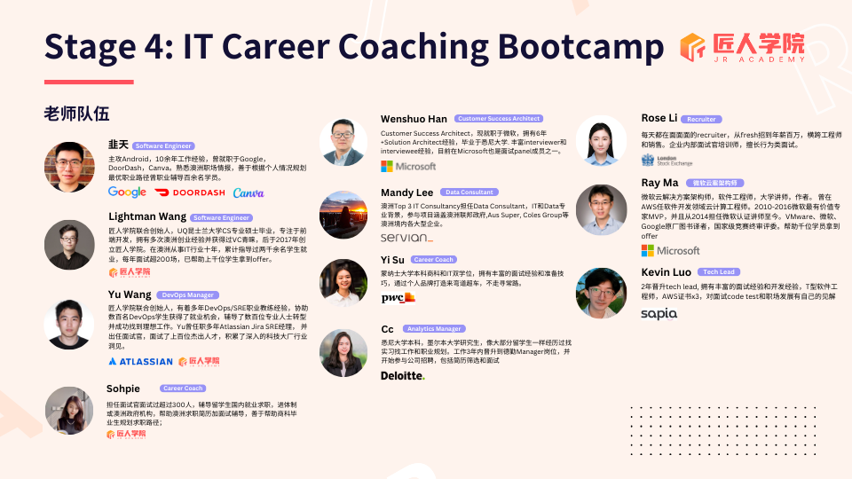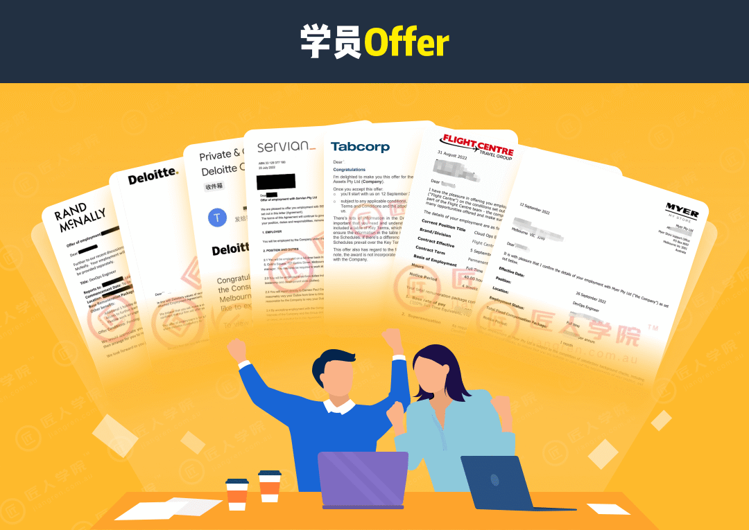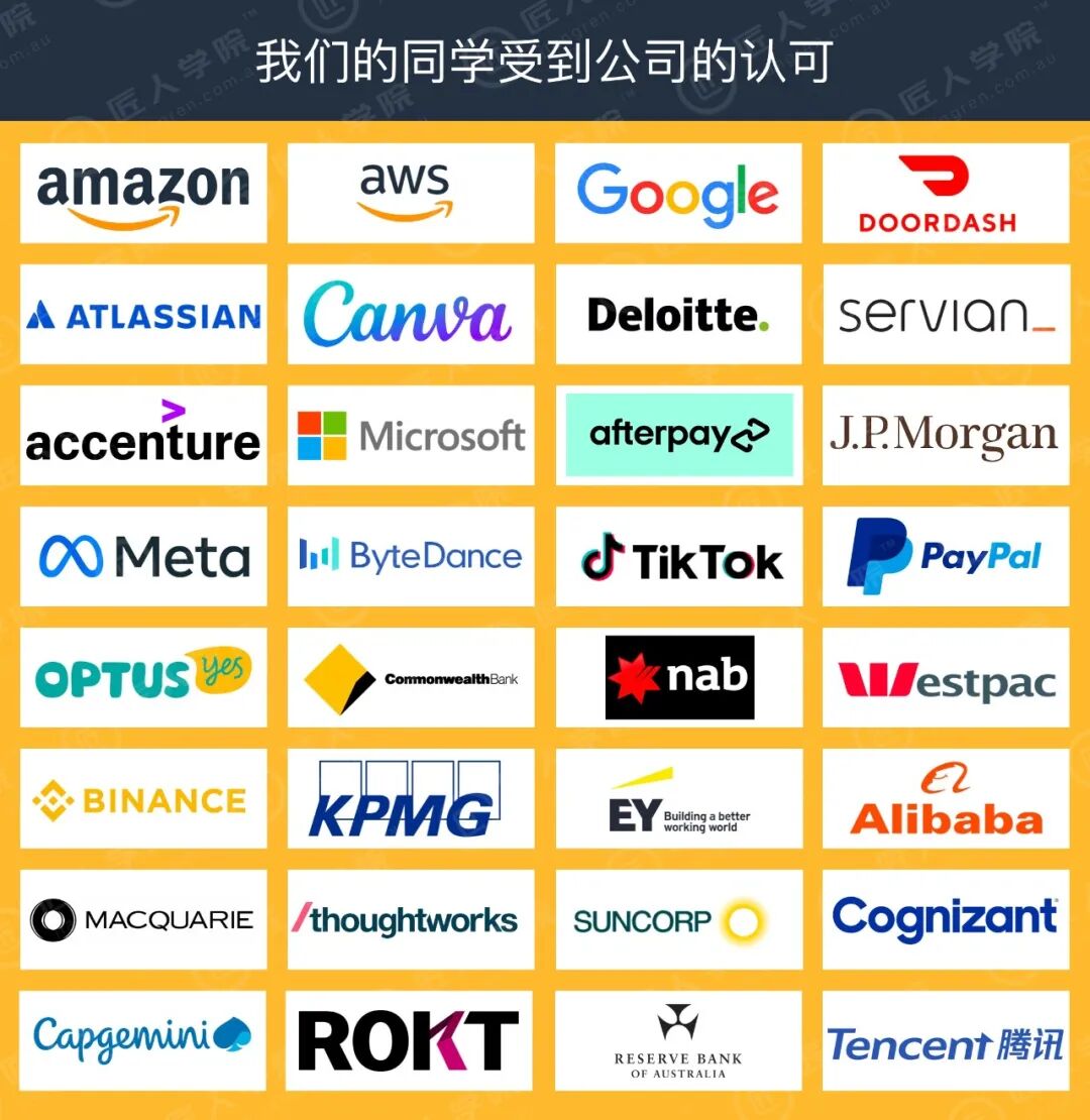 我们的学生受到来自大公司 Amazon, AWS, Google, Doordash, Atlassian, Canva, Deloitte, Accenture, Microsoft, Afterpay, JP Morgan, Meta, Bytedance, Tiktok, Paypal, Optus, Commonwealth, Nab, Westpac, 币安, KPMG, EY, Alibaba, macquarie bank, thoughtworks, Servian, Suncorp, Cognizant, Capgemini, Rokt, Reserve Bank of Australia, Tencent, Bunnings, AusPost 等的认可。