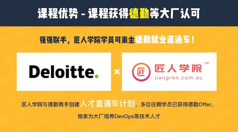 更值得一提的是,匠人学院与多家大公司建立了紧密的合作关系,例如与 Deloitte 等企业有直接的内推机制,为学员们提供宝贵的就业机会,开启他们在 DevOps 领域的职业生涯!