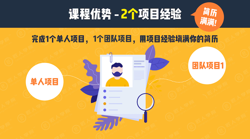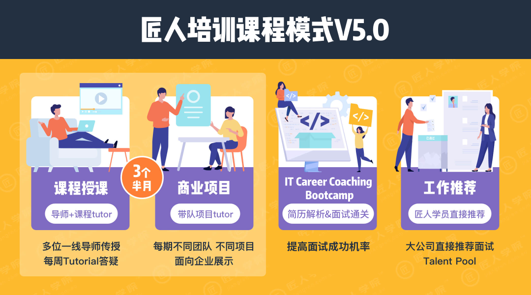 匠人学院根据市场及企业需求以及学生反馈,不断升级,目前已经进入培训 5.0 模式!学生在两年内有两次免费重听的机会哦,还能参与两次团队大项目,并且享受永久视频回放。