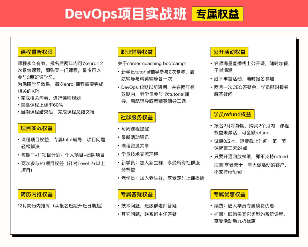 老学员:报名 DevOps 项目实战班后,第一次参与的课程结课后,统称为老学员(这里主要指 enroll 课程期间内)。