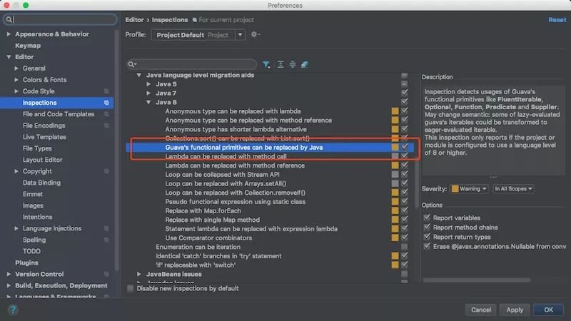 当然,你也可以通过在Preferences搜索"Guava"来Kill掉这个Yellow的提示。