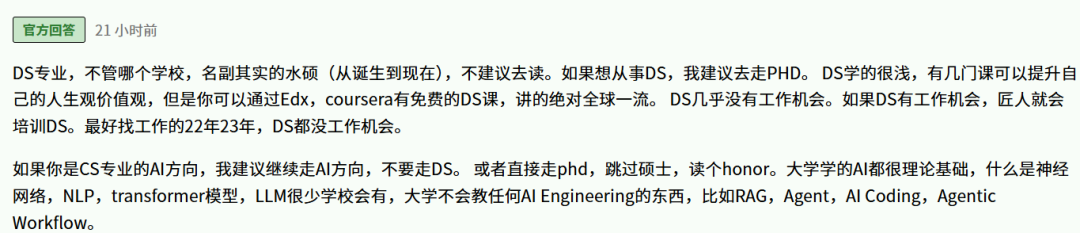 “如果你是CS专业的AI方向,我建议继续走AI方向,不要走DS。大学学的AI都很理论基础,什么是神经网络,NLP,transformer模型,LLM很少学校会有,大学不会教任何AI Engineering的东西,比如RAG,Agent,AI Coding,Agentic Workflow。