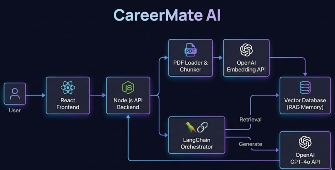 不是因为他学校有多好,而是他的 Project Experience 栏里写着的项目:CareerMate AI。而紧跟其后的 Tech Stack 描述,终于不再是那些陈词滥调,而是写着:React, Node.js, LangChain, OpenAI API, RAG (Vector Search), Docker, AWS。