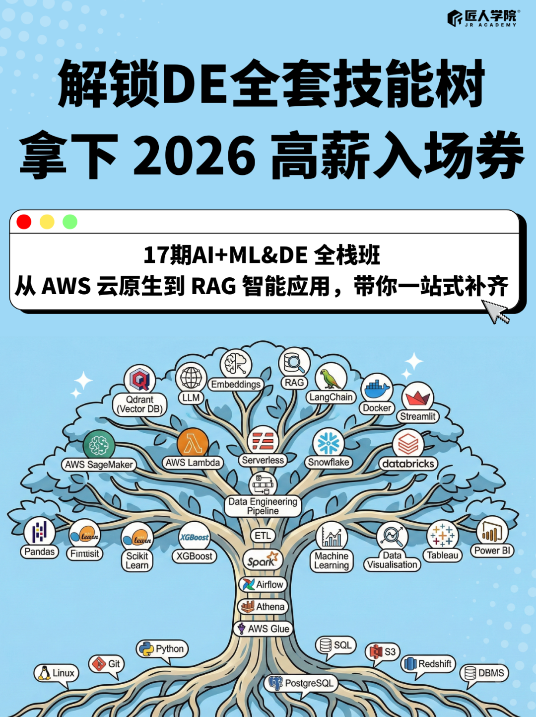 为了让你在 2026 年的求职季拥有“降维打击”的竞争力,匠人学院第17期 AI+ML&DE 全栈项目班重磅升级 7.0 课程体系,直击 Gartner 趋势下的职场刚需。本周日 (1月25日),第17期正式发车!