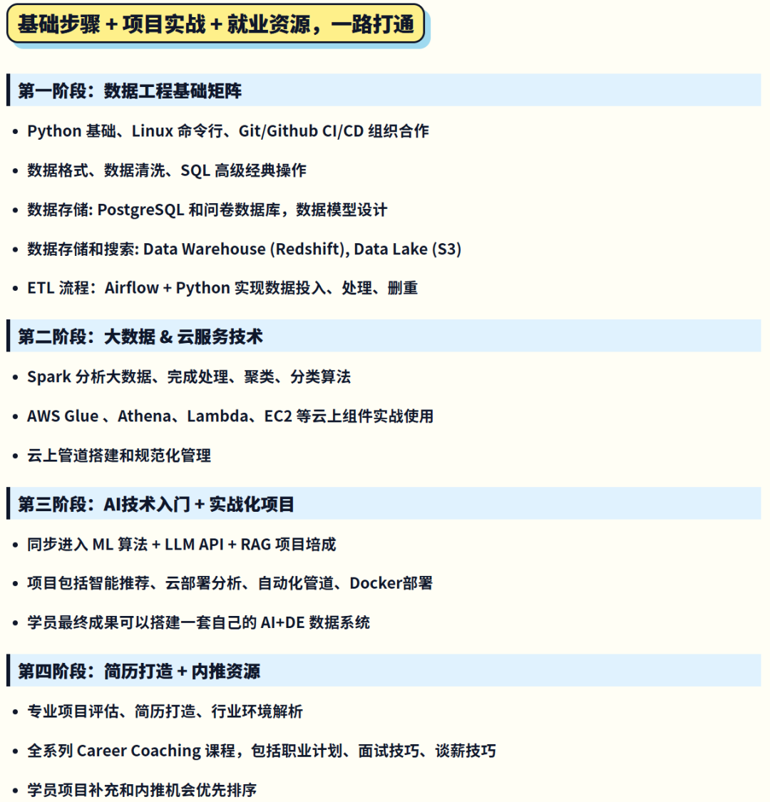 导师团队来自AWS、CBA等一线大厂,多年数据工程和机器学习实战经验。不教屠龙之技,只讲真正能用在工作中的东西。