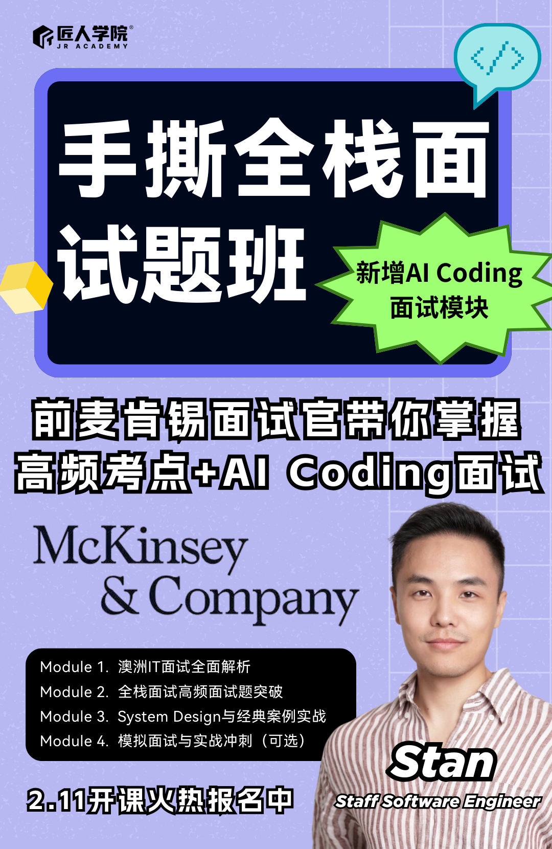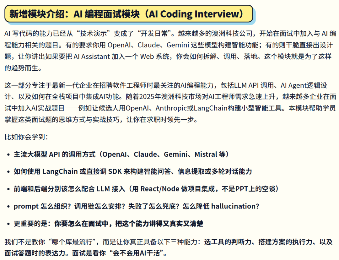 2026 年这版课程,课程新增了一个非常重要的模块 —— AI 编程面试(AI Coding Interview),因为我们发现,哪怕是同一家公司、同一岗位,现在面试问法和重点也已经发生了明显变化。