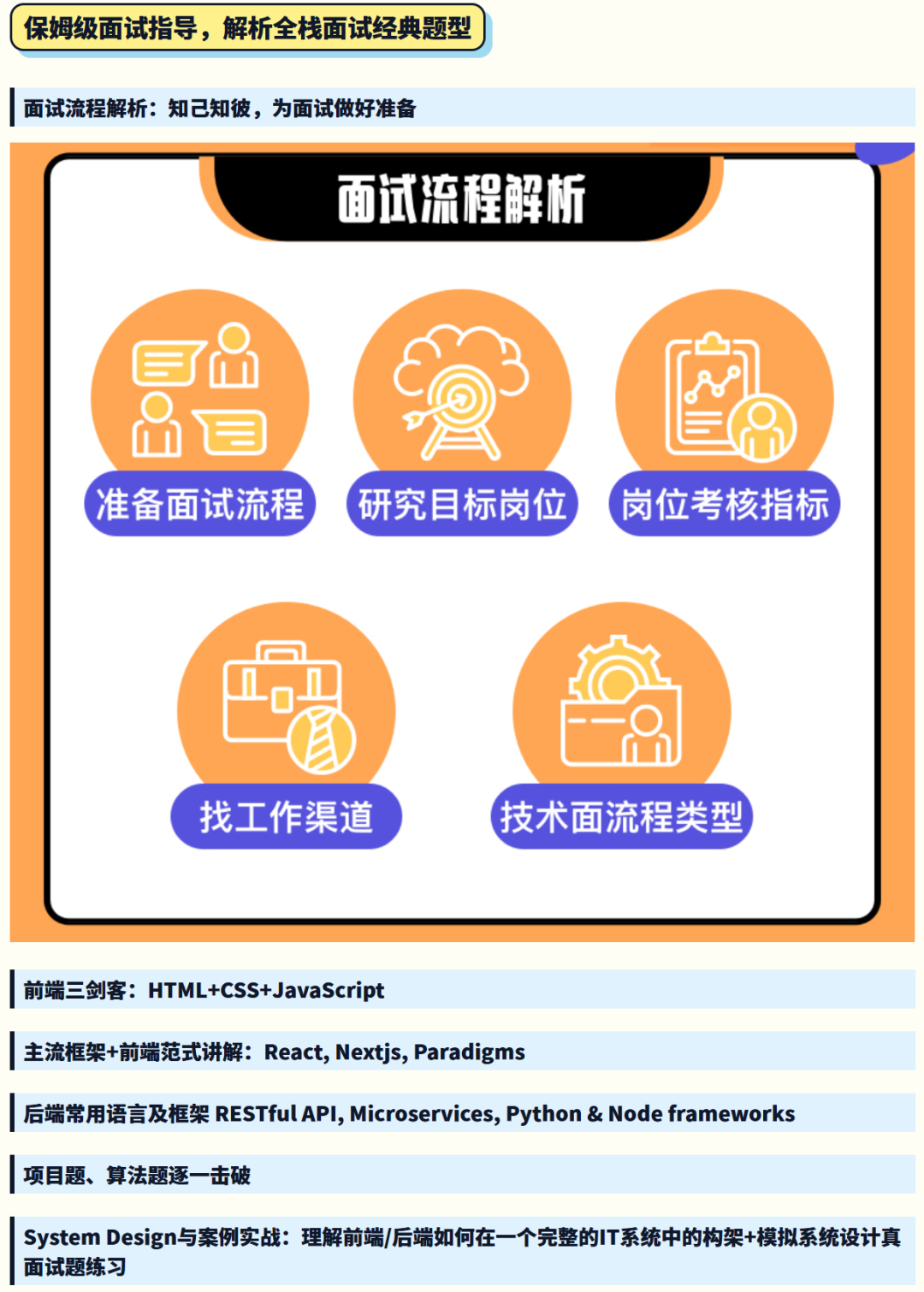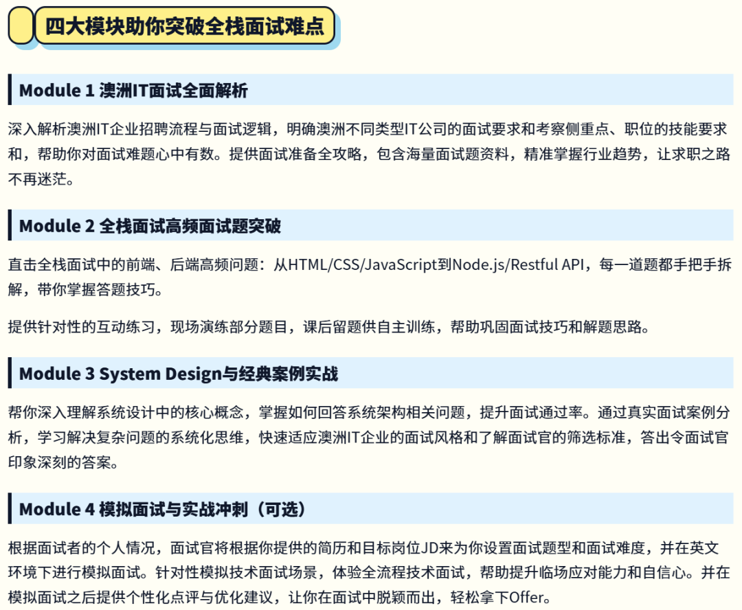 这一次课程也系统升级了原有的高频题模块、系统设计讲解和面试答题框架,让你能更全面地应对从初创公司到大厂的全栈技术面试。