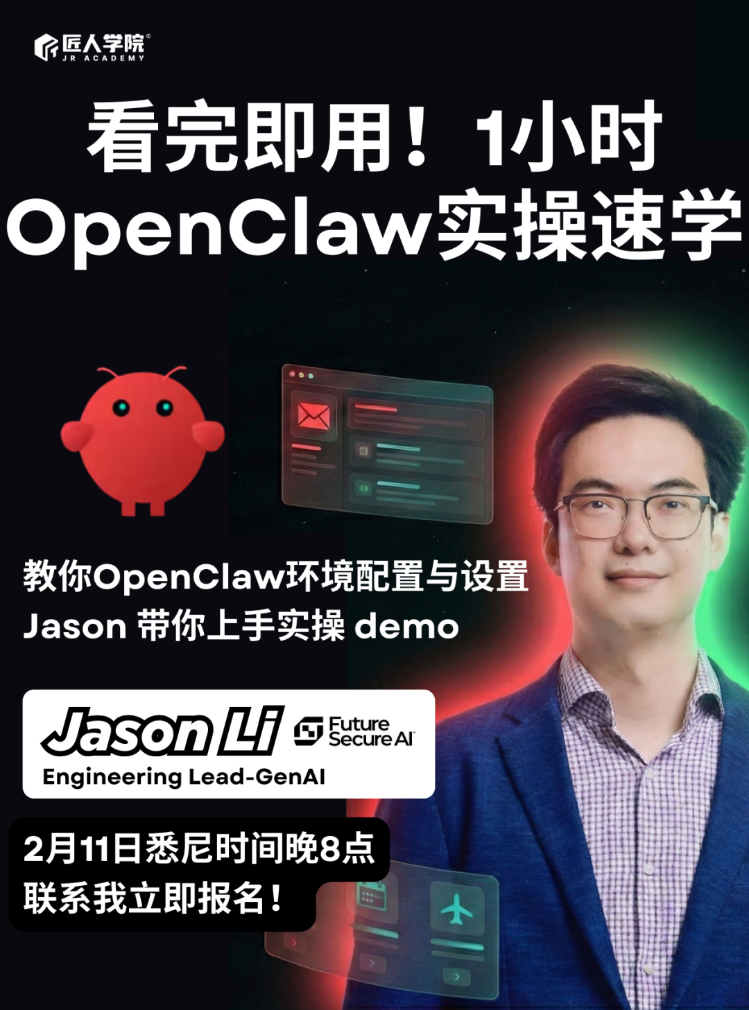 现在机会来了!匠人学院拥有丰富AI架构经验的 Jason Li 老师 主讲,全程硬核演示,手把手教你配置OpenClaw!