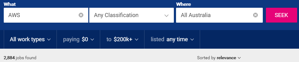 正因为AWS广泛的业务范围和多样化的服务供应,其越来越受到雇主的青睐。如下图所示,在整个澳洲范围内,Indeed上有3029个AWS相关工作,Seek上有2884个AWS相关工作,Jora上有5546个AWS相关工作。