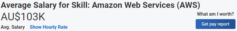 此外,掌握AWS在某种程度上也意味不错的薪酬,如PayScale上显示的,在澳洲范围内AWS Skill的平均薪资约为$ 10,3000