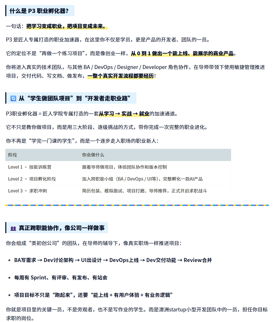 匠人学院第 29 期全栈bootcamp为本地在读学生设计,直接升级成‼️【Junior AI Engineer方向】,分别开设【英文班➕中文班】!让孩子在毕业前就把企业要的AI product能力全部补齐,让他在澳洲市场里更有竞争力。👇