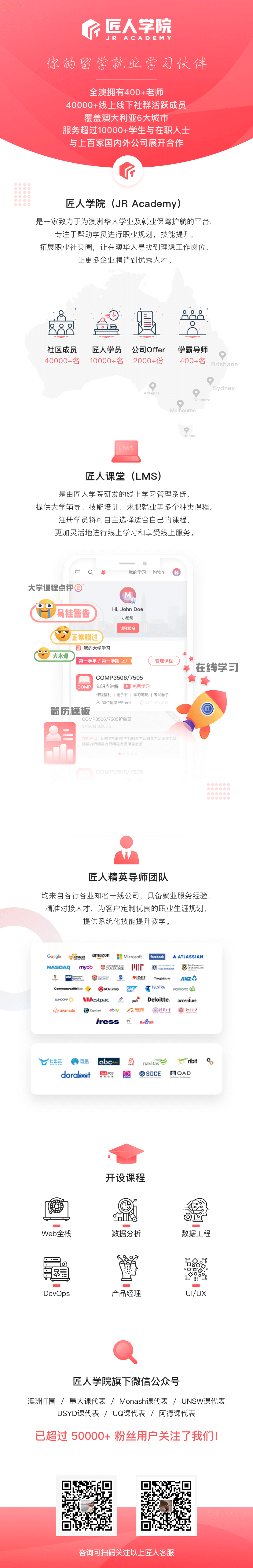 于2017年创立匠人学院在澳洲从事IT行业十年,累计指导过两千名学生就业,每年面试超过200场,已经帮助上千名学生拿到offer。