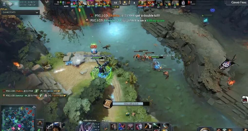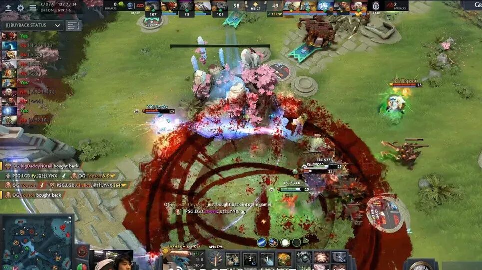 比赛来到了最终的决胜局,在本届Ti最为关键的这场比赛中,LGD求稳拿到了自己擅长的TB和牛头,而OG则选择了猛犸宙斯火猫三核。前中期,LGD一度在场上取得了较大的优势,但在TB装备BKB后LGD在一波肉山团中处理不当,被OG反打团灭。随后LGD明显心态出了问题,急于打开局面,但AME一波失误的走位导致自己直接被秒并且无法买活,被OG连破LGD两路,突然死亡。