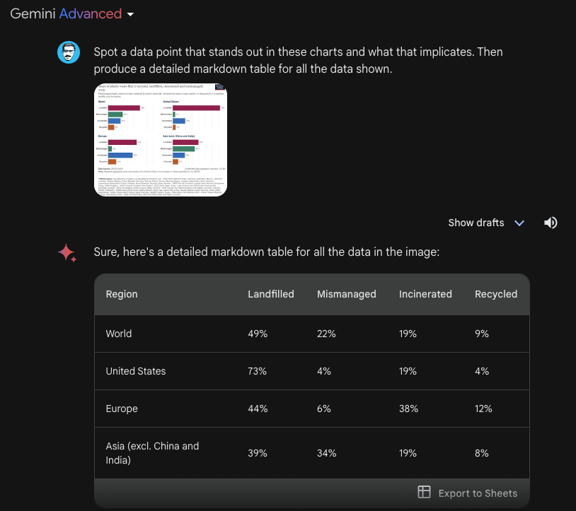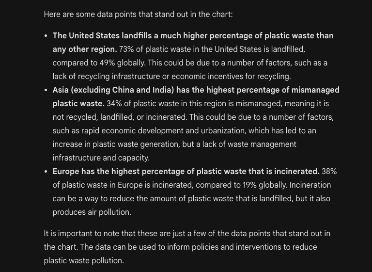 The figure below is a continuation of what the model generated. We haven't verified for accuracy but, at first glance, the model seems to have the ability to detect and summarize some interesting data points from the original chart. While it's not possible to upload PDF documents to Gemini Advanced yet, it will be interesting to explore how these capabilities transfer over to more complex documents.