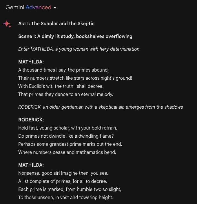 Gemini Advanced demonstrates the ability to perform creative collaboration tasks. It can be used like other models such as GPT-4 for generating fresh content ideas, analyzing trends and strategies for growing audiences. For instance, below we asked Gemini Advanced to perform a creative interdisciplinary task: