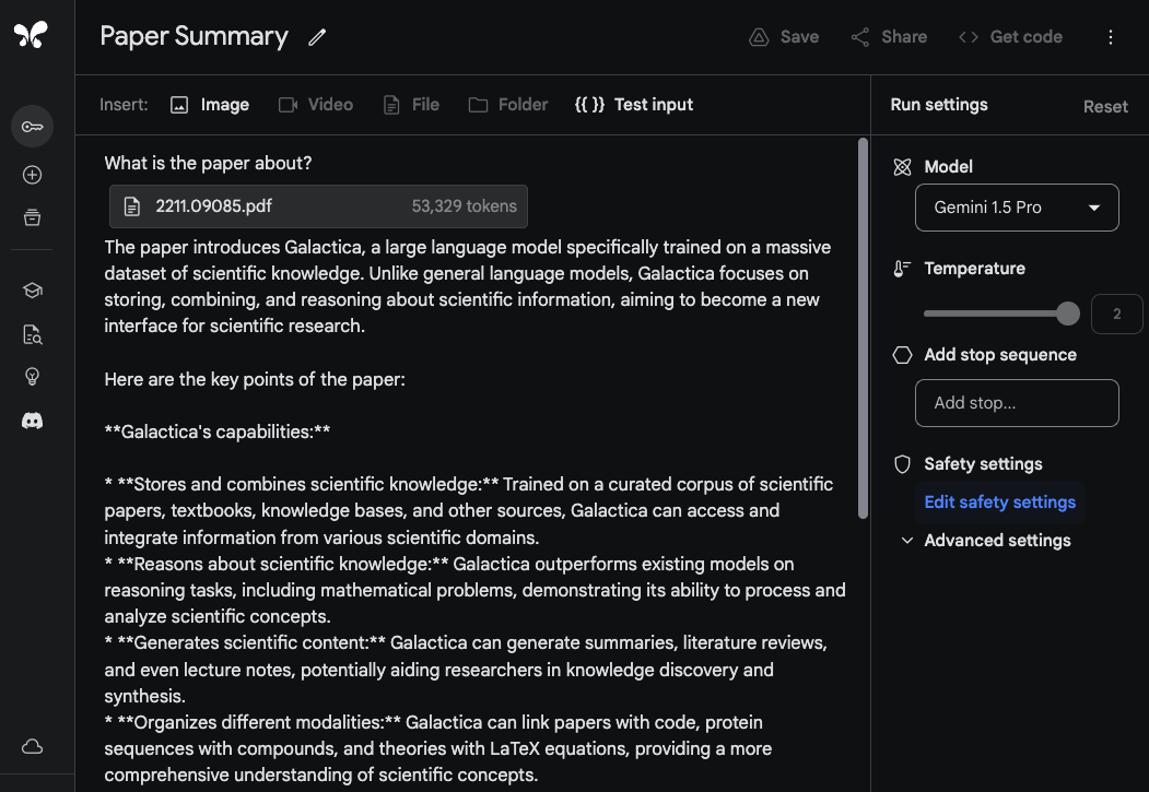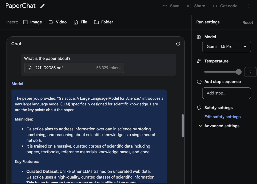 The model's response is accurate and concise as it provides an acceptable summary of the Galactica paper. The example above uses a freeform prompt within Google AI Studio but you can also use the chat format to interact with an uploaded PDF. This is a useful feature if you have many questions you would like to get answered from the provided document/s.