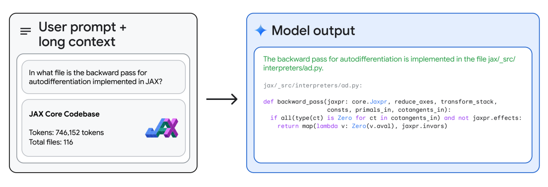 With its long-context reasoning, Gemini 1.5 Pro is can answer questions about the codebase. Using Google AI Studio, Gemini 1.5 Pro allows up to 1 million tokens, so we can upload an entire codebase and prompt it with different questions or code-related tasks. The technical report provides an example where the model is given the entire JAX codebase in context (~746K tokens) and asked to identify the location of a core automatic differentiation method.