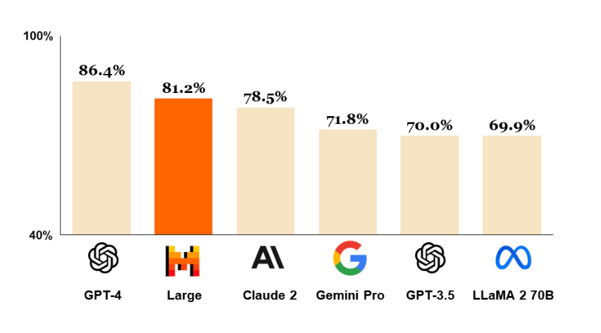 Below is a chart showing how Mistral Large compares with other powerful LLMs like GPT-4 and Gemini Pro. It ranks second next to GPT-4 on the MMLU benchmark with a score of 81.2%.