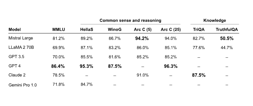 The table below shows how Mistral Large performs on common reasoning and knowledge benchmarks. It largely falls behind GPT-4 but it's the superior model compared to other LLMs like Claude 2 and Gemini Pro 1.0.