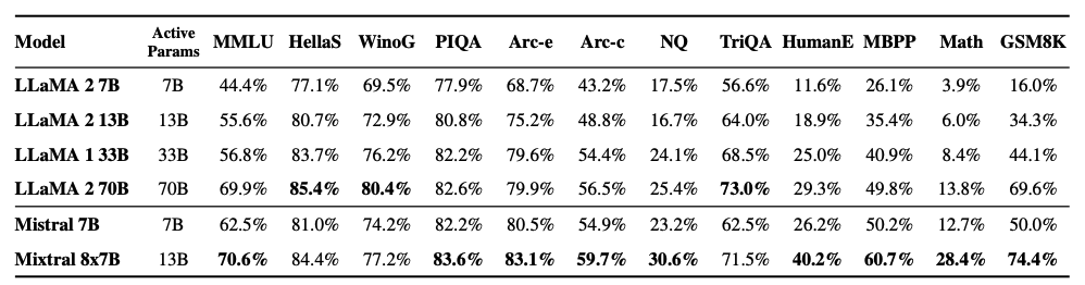 Mixtral matches or outperforms models like Llama 2 70B and GPT-3.5 as shown in the table below: