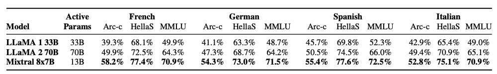 The table below shows the capabilities of Mixtral for multilingual understanding and how it compares with Llama 2 70B for languages like Germany and French.
