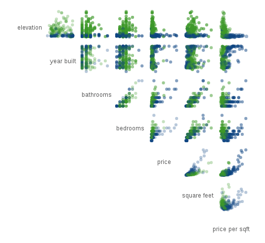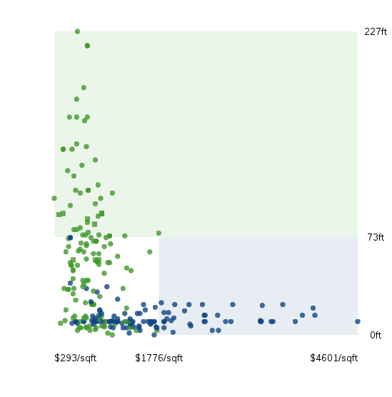 这次选择的维度是单价。还是使用前面的公式,统计发现,对于海拔高度低于73英尺的房产,单价的门槛值是每平方英尺1776美元(纽约较贵,洛杉矶较便宜)。