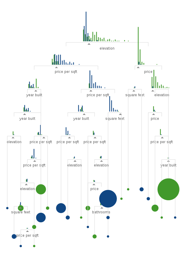 经过七层的决策树,依然有可能无法对数据分类。比如,如果某个洛杉矶房产的七个指标,与纽约的房产完全一致,那就会分类失败。
