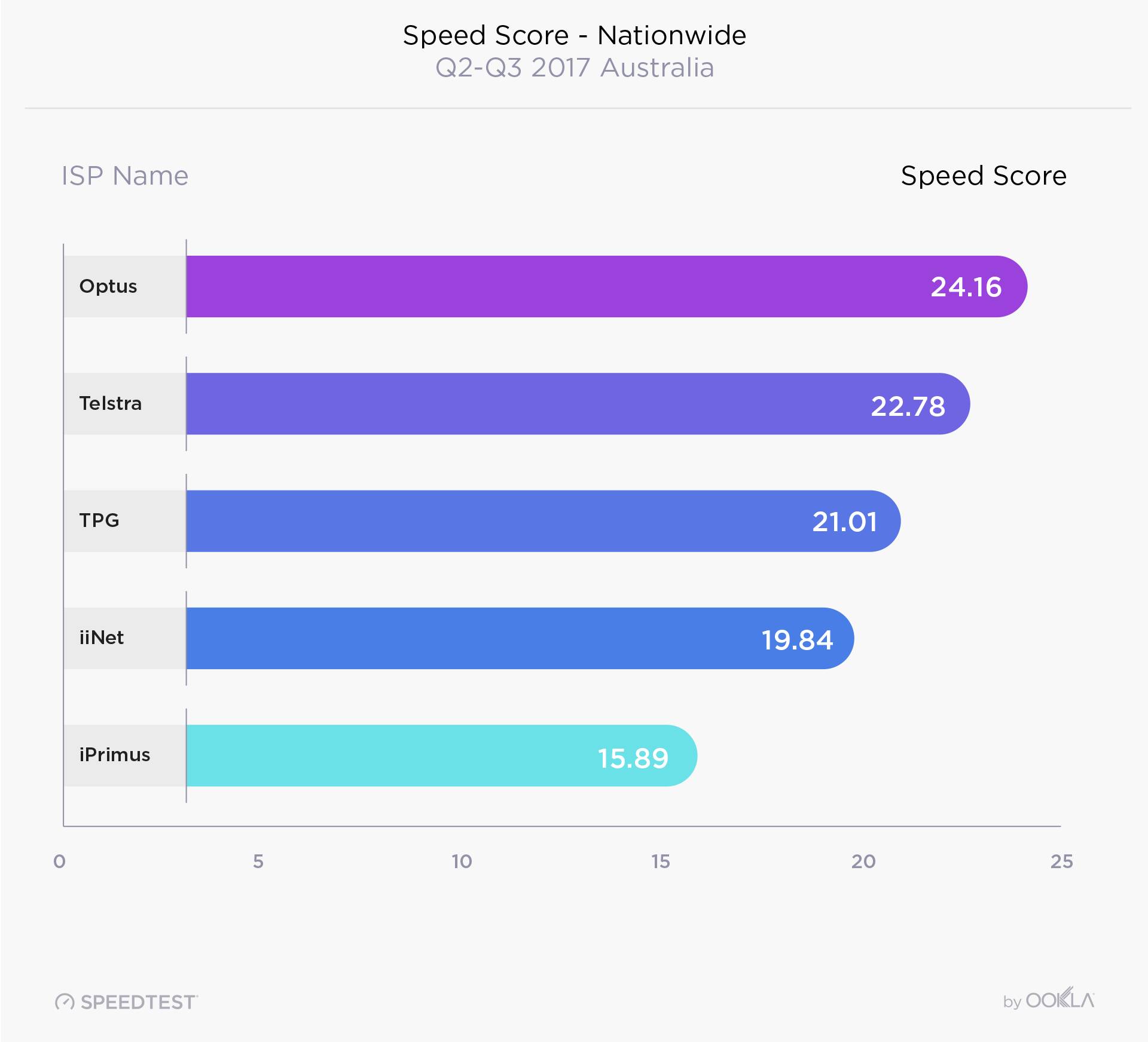 根据Speedtest的数据,2017年第二至第三季度期间,平均网络下载速率为24.12Mbps,上传速度为8.48Mbps。跟据网速综合评分,Optus是澳大利亚速度最快的提供商,网速综合得分为24.16;Telstra和TPG分别排名第二和第三,网速综合打分为22.78和21.01; iiNet以19.83排名第四,iPrimus以15.89排名倒数第二。